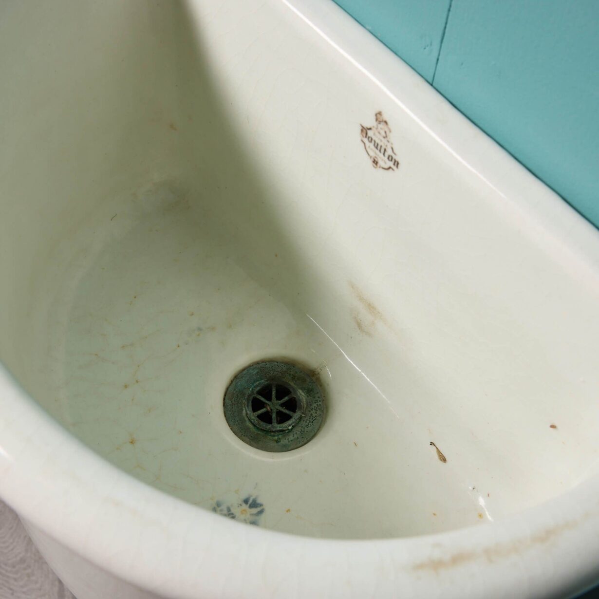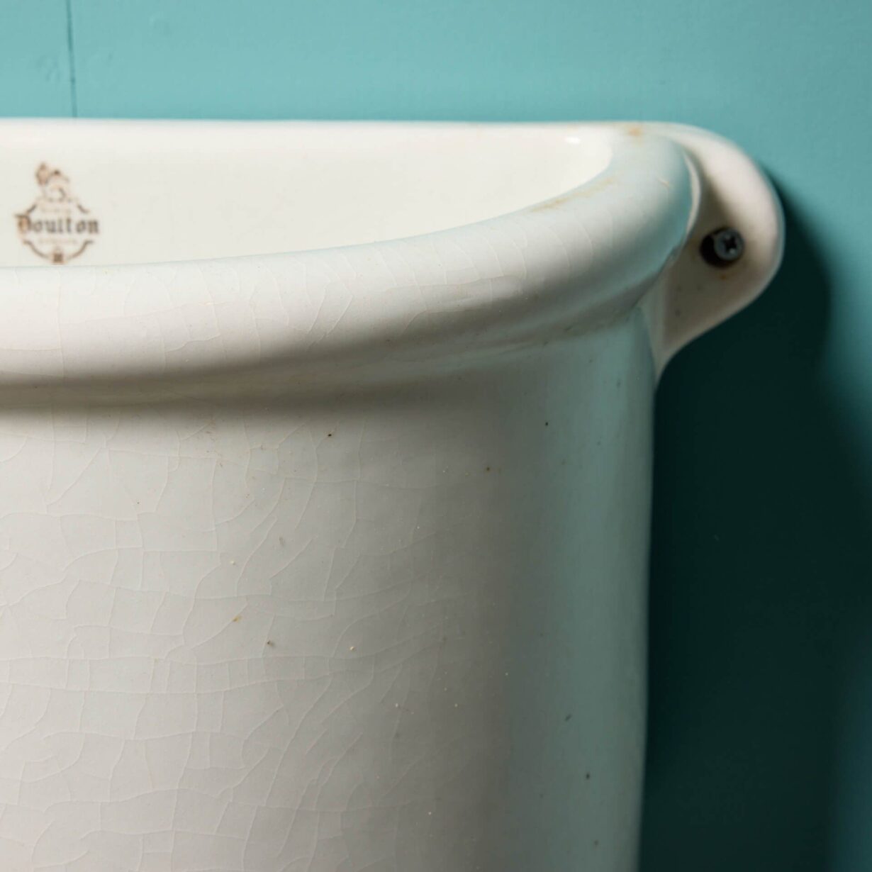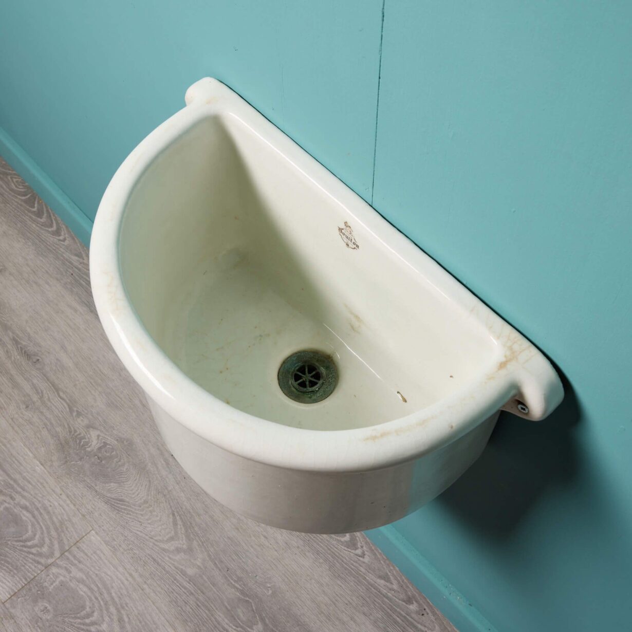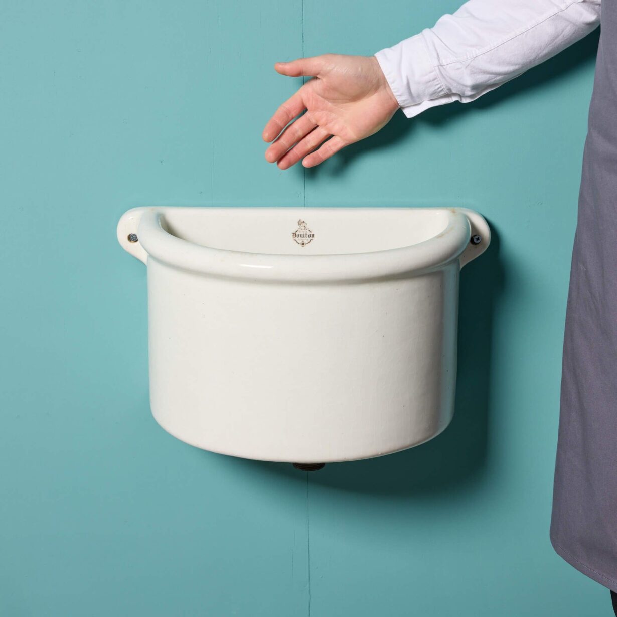 back to topAn early 20th century Doulton & Co wall mounted semi-circular antique sink. This interesting sink is of small and narrow proportions, and not like anything we have seen from Doulton & Co before. Its petite scale would make a beautiful utility or cloakroom sink in a reclaimed or country style home, paired with wall mounted taps for a chic look.