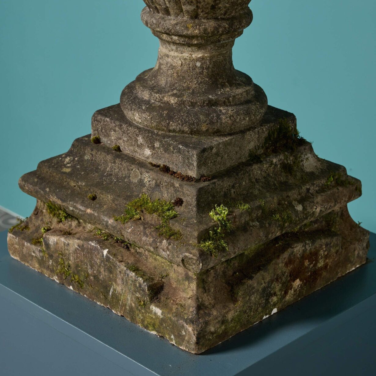 Beneath the characterful weathered surface of this large scale finial is white statuary marble, with an impressive layered square base and rounded socle.