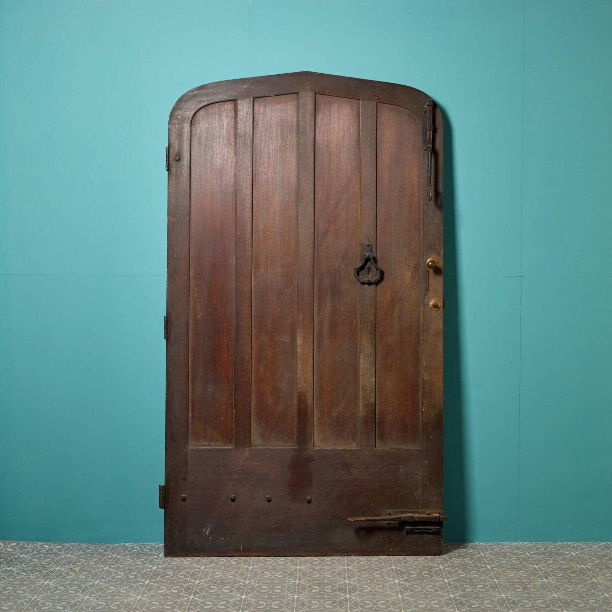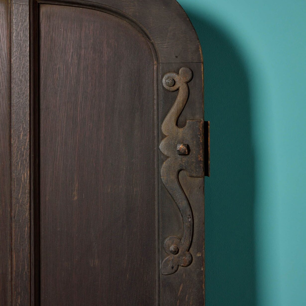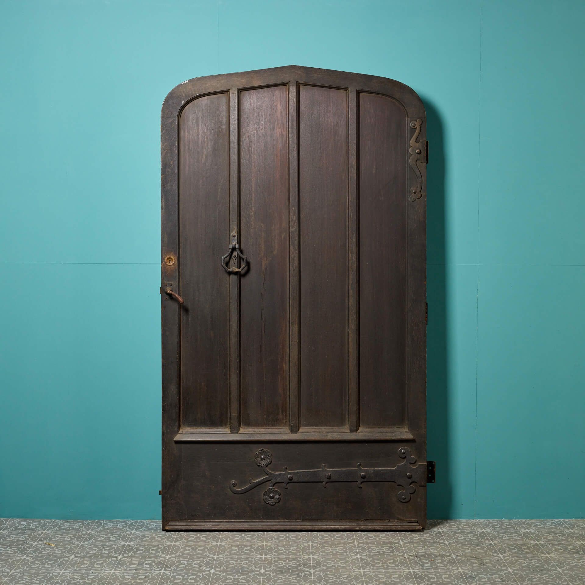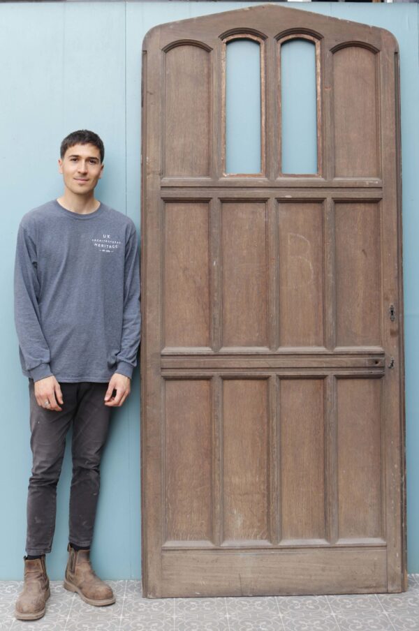 back to topA very wide Victorian arched oak exterior door with arts and crafts styling circa 1890. With an original pull handle, bolts and stylised strap hinges, this antique door makes an impressive front door or entranceway to a converted chapel, barn or Victorian cottage. It is of solid construction and heavy, perfect for use as an exterior door.