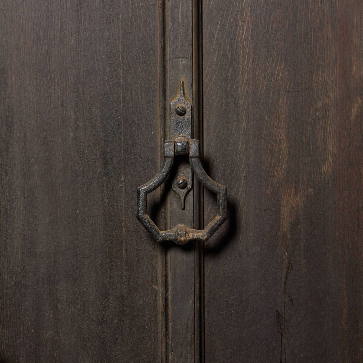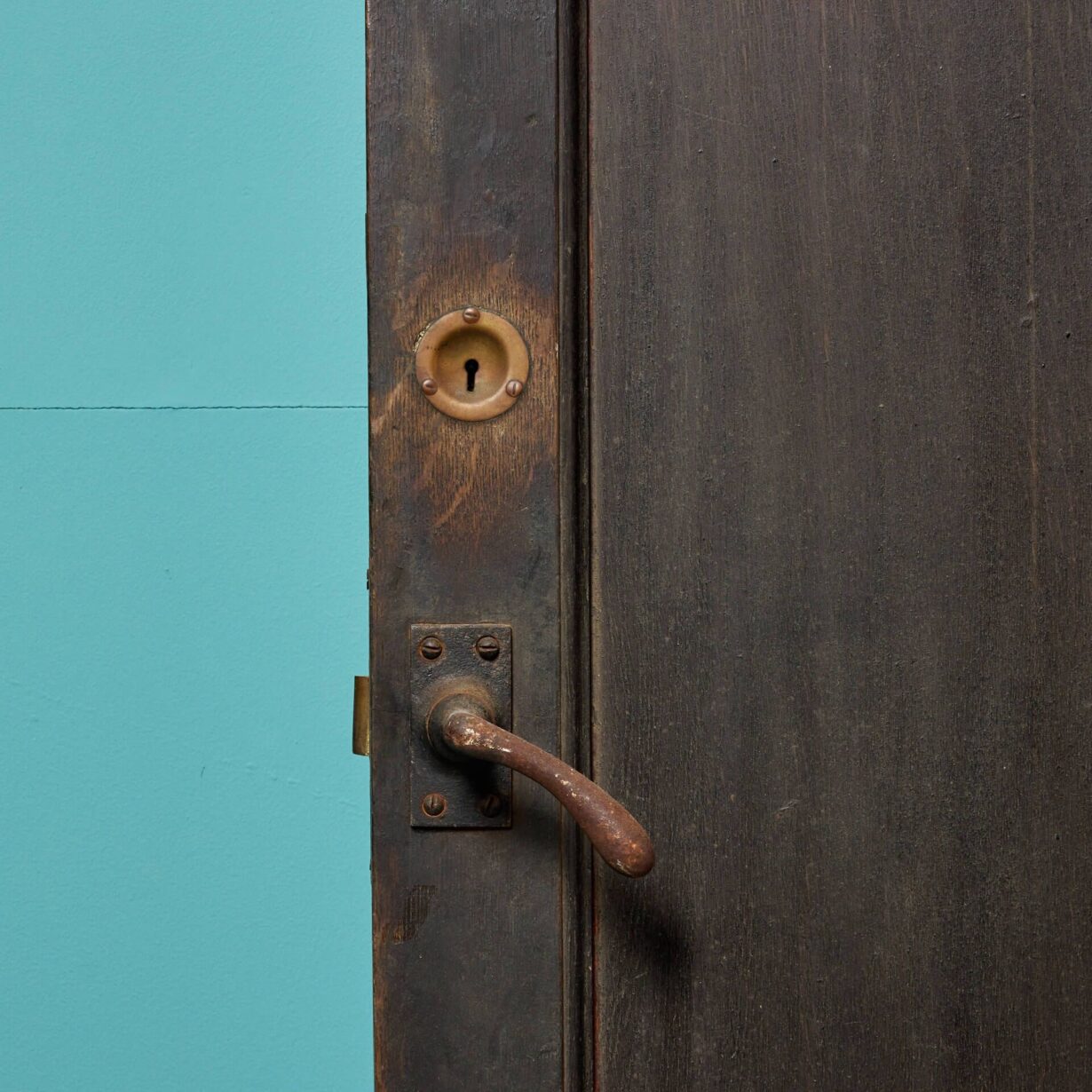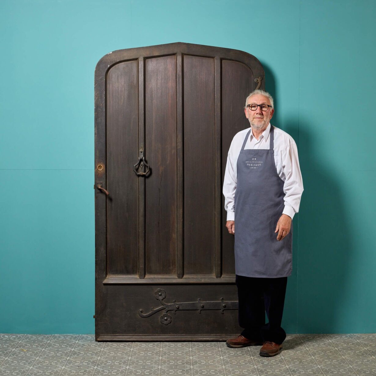 back to topA very wide Victorian arched oak exterior door with arts and crafts styling circa 1890. With an original pull handle, bolts and stylised strap hinges, this antique door makes an impressive front door or entranceway to a converted chapel, barn or Victorian cottage. It is of solid construction and heavy, perfect for use as an exterior door.