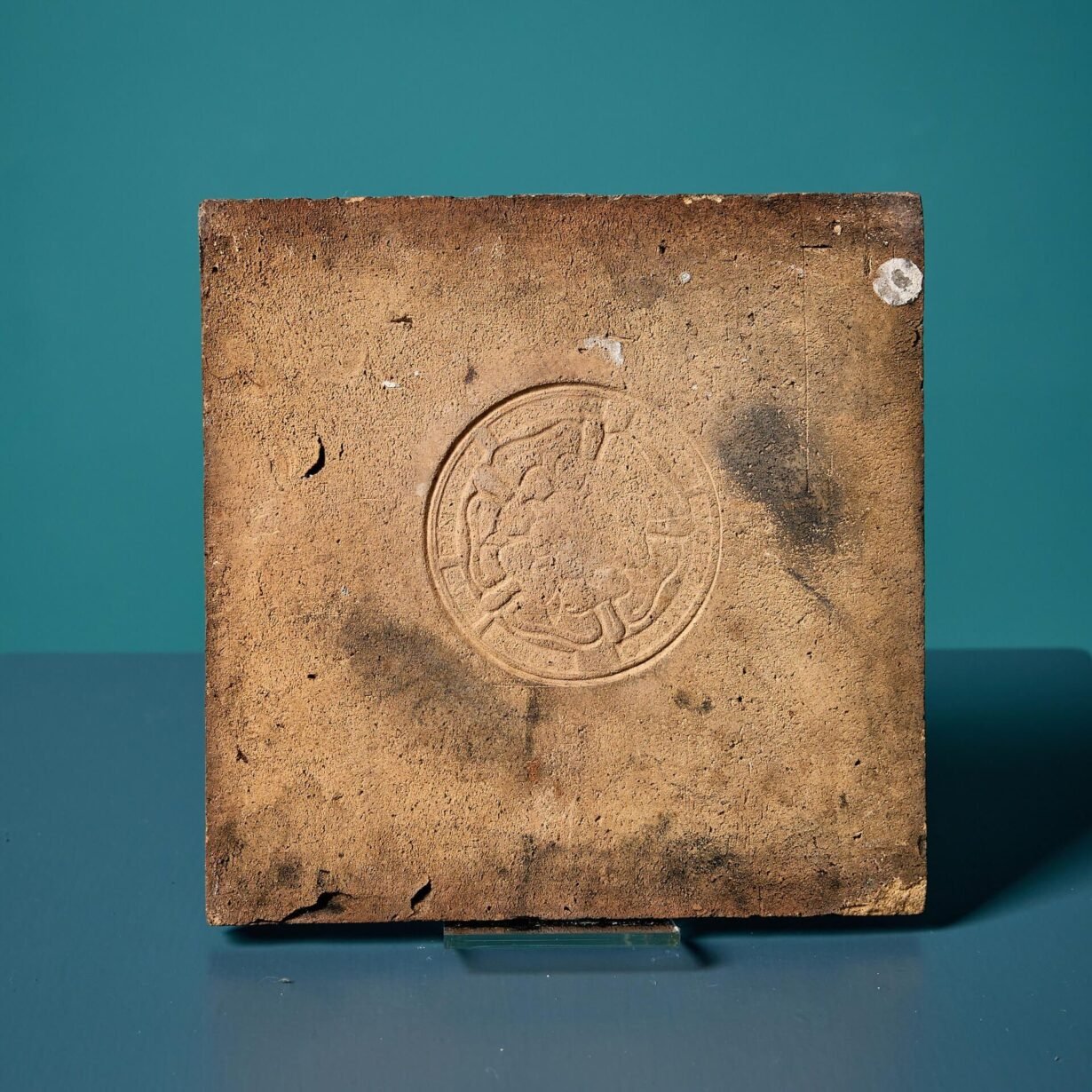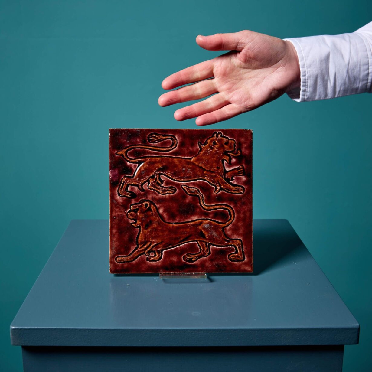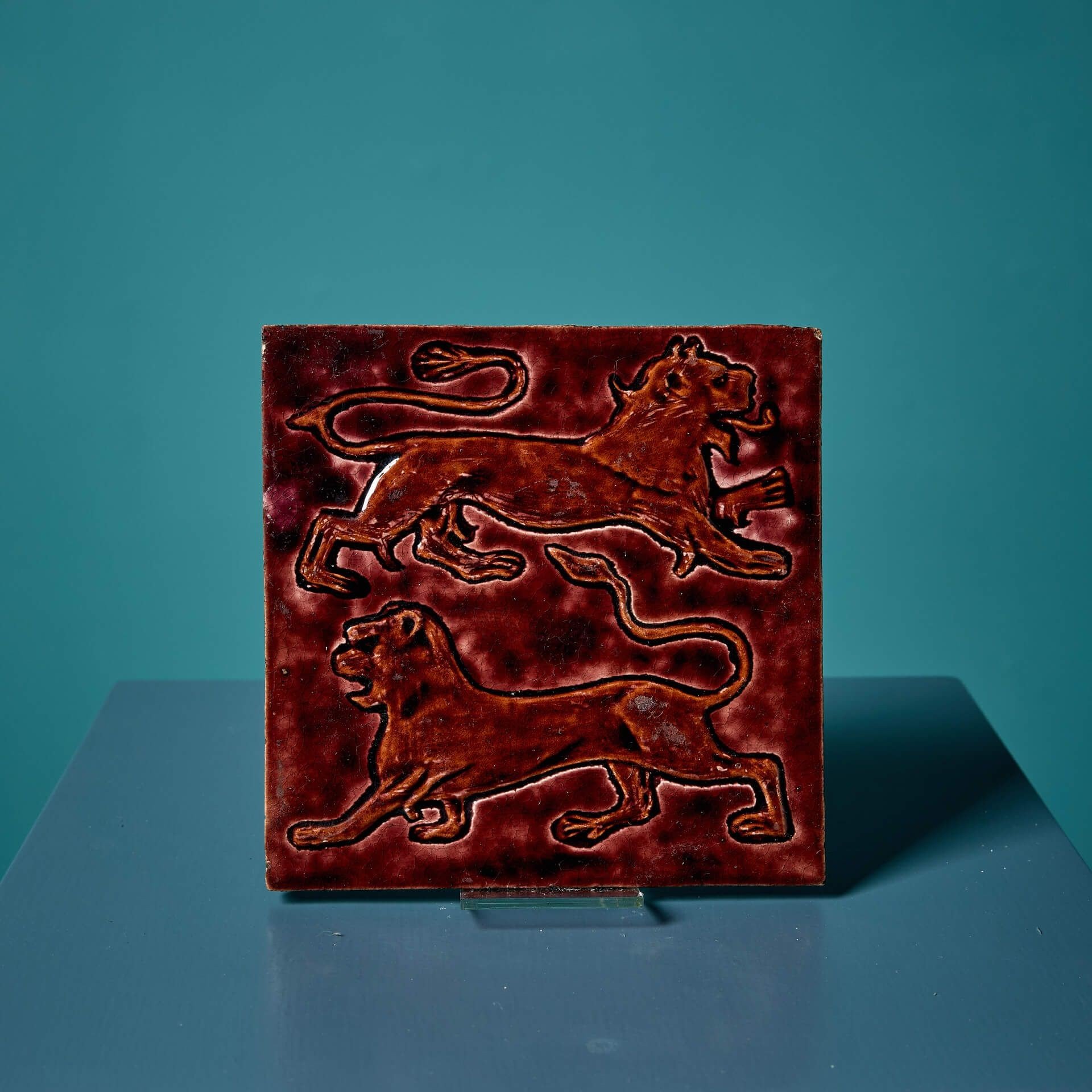 Dating from the late 19th century, this tile is embossed with two passant lions in a glossy red-brown glaze. Another tile, near identical to this one, resides in the Smithsonian Design Museum, New York.